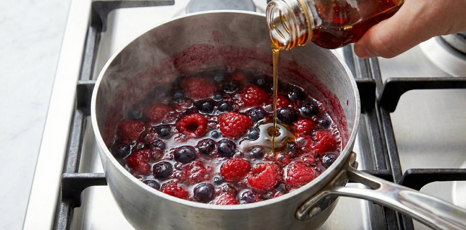 5. Sosu Hazırlama: Orman meyvelerini küçük bir tencereye alın. Üzerine HURMALAB Hurma Şurubu ve suyu ekleyin. Orta ateşte meyveler yumuşayıp sos hafifçe koyulaşana kadar 5-6 dakika pişirin.