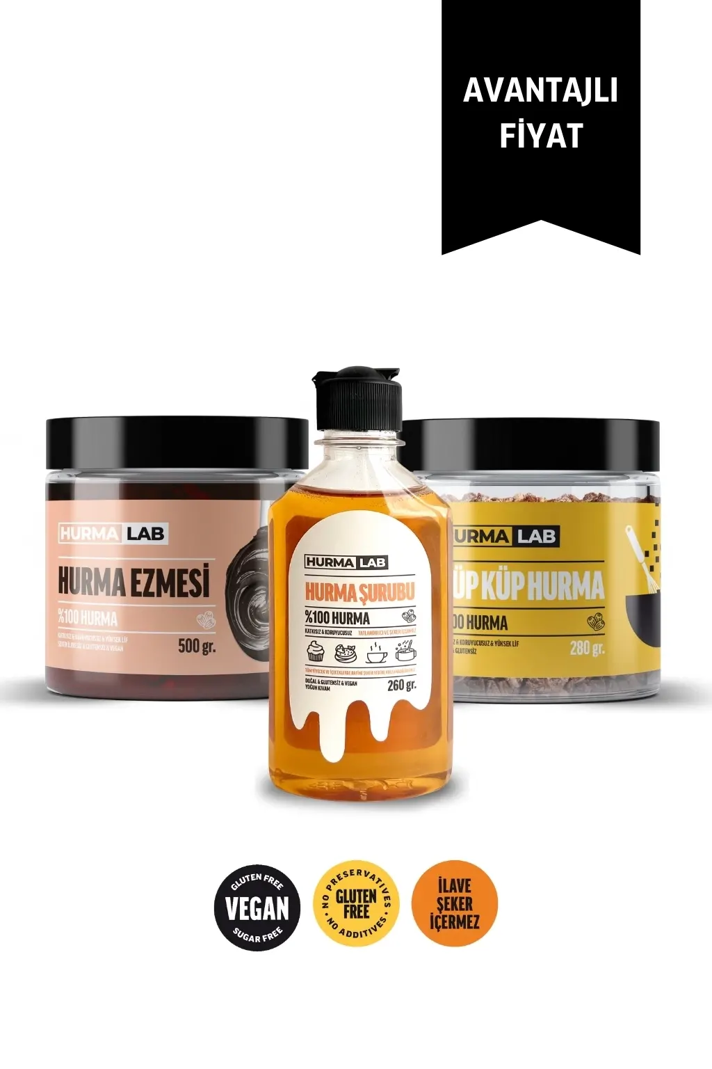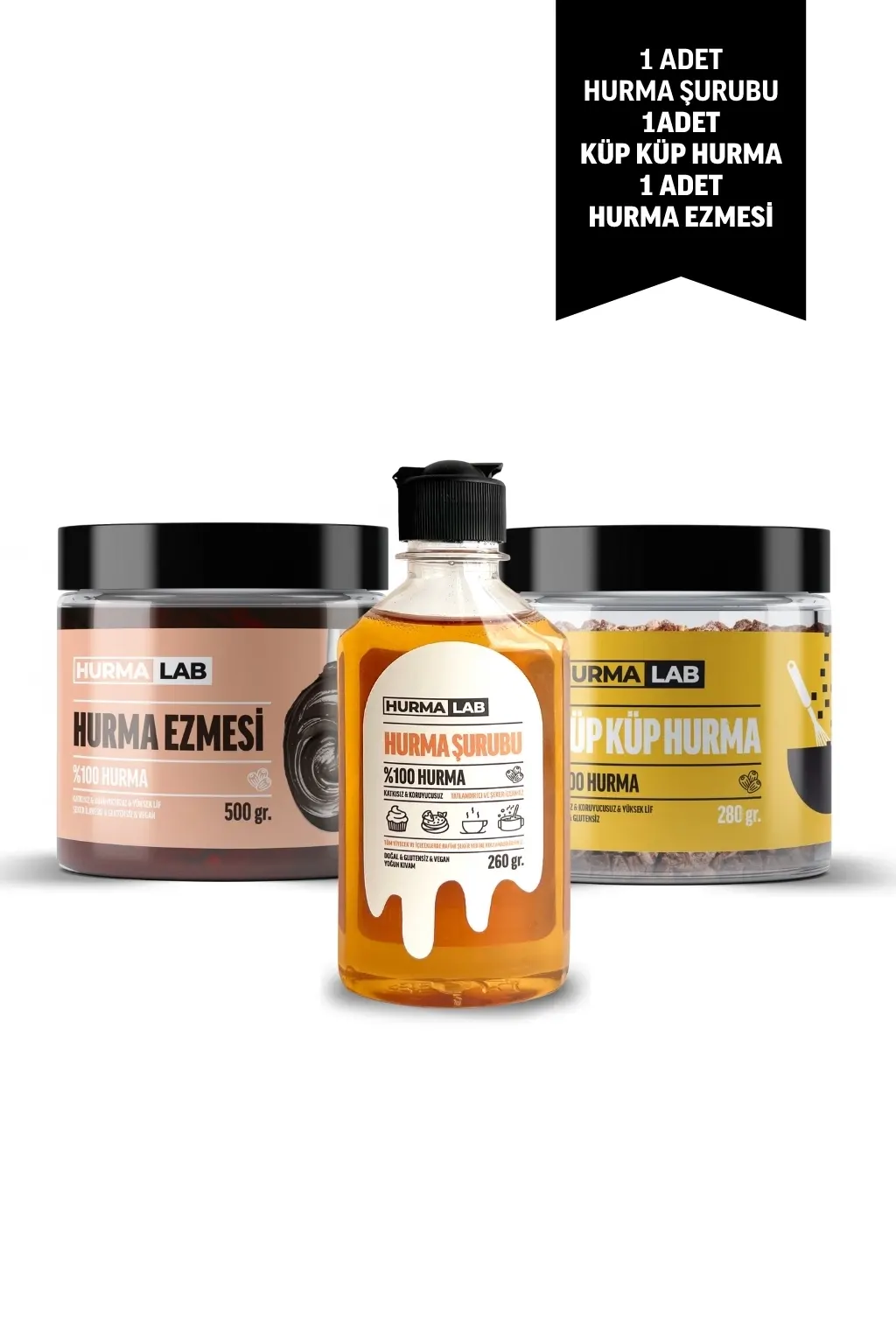 Tanışma paket içinde 1 adet Hurma Şurubu 260 gr., 1 adet Hurma Tozu 280 gr., ve 1 adet Hurma Ezmesi 500 gr. bulunur.